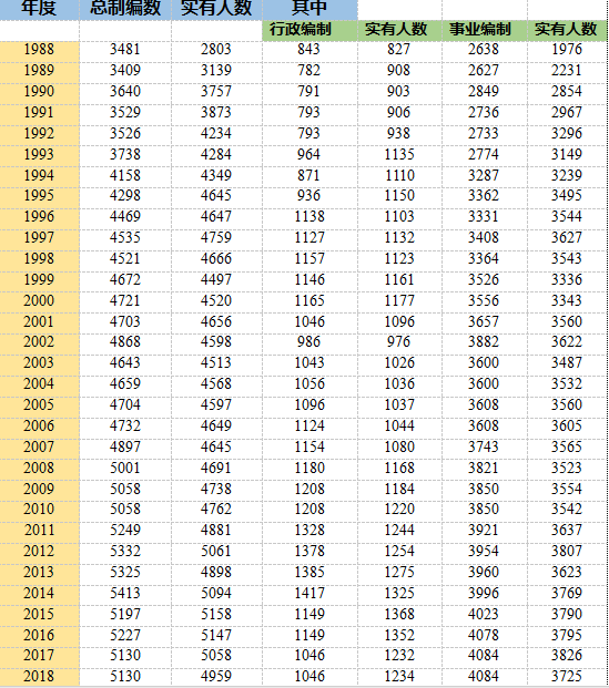 1988年至2018年云龙县行政事业单位编制数和实有人数一览表