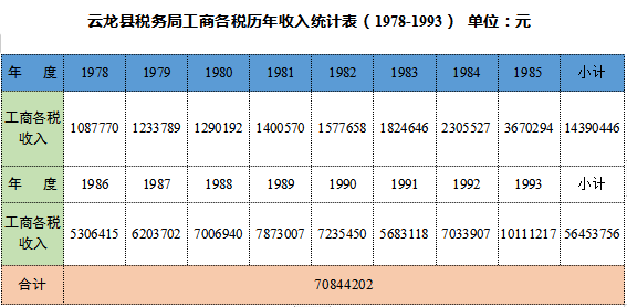 自1987年以来,云龙县税务部门从1978年到2017年的40年间,根据国家税收法律法规和政策,结合云龙县税源实际,认真组织征收各种税款。税务机关征收的各种工商税总收入达到14.63亿元(不含1994年以后云龙县地方税务局征收的部分),为云龙县地方经济建设筹集了大量资金。