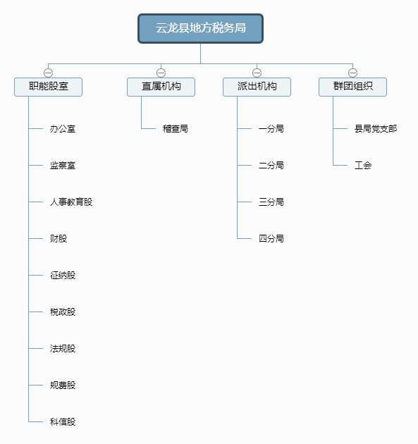 1995年7月10日大理州地方税务局首次确定云龙县地方税务局“三定”方案,内设机构为股级建制。2011年11月,经过多番机构改革的完善调整,云龙县地方税务局确定机构设置,县局机构设置7股2室,即:人事教育股、计划财务股、征收管理和纳税服务股、税政股、政策法规股、科技信息股、规费管理股、办公室、监察室,设置1个直属机构即稽查局,设置4个派出机构,即:一、二、三、四分局,依法承担规定范围内的税费征管工作。