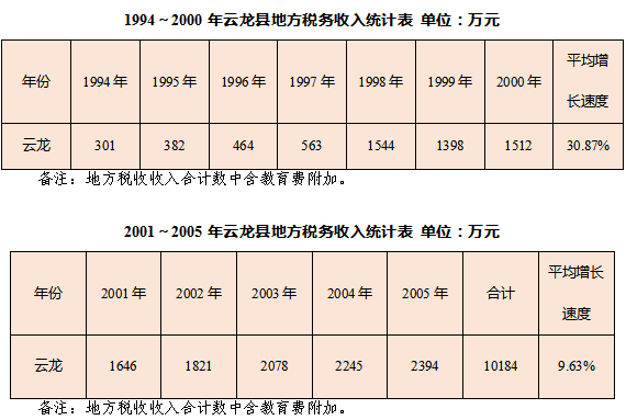 1994~1995年及“九五”时期(1996~2000年),云龙县税源单薄、收入规模小,税源分布极不平衡。云龙县地方税务局分别组织税收收入301万元、382万元、464万元、563万元、1544万元、1398万元、1512万元。