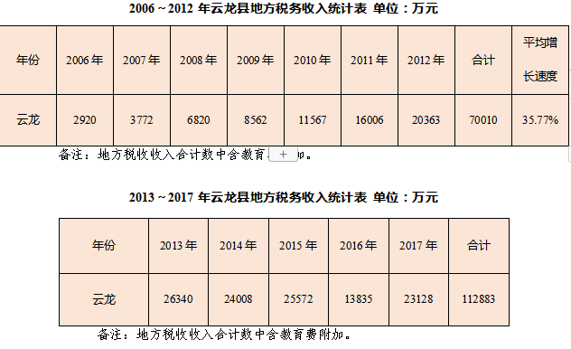 “十三五”前期(2016~2017年),受经济下行不减、“营改增”政策减收等因素影响,云龙县地方税务局分别组织税收收入13835万元、23128万元。