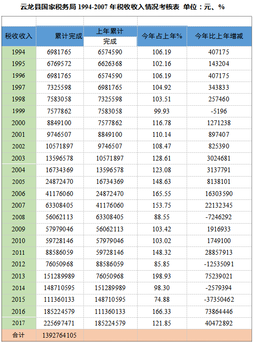 云龙县地方税务局自成立起,到2018年7月,历经24个春秋,始终坚持“为国聚财、为民收税”工作宗旨,牢牢把握“依法治税、从严带队”工作主题,紧紧抓住征管改革这一核心,地方税收征管质量和效率显著提高,地税干部优质高效的服务能力、执法水平和综合素质不断提升,地方税费收入规模不断壮大,为云龙县经济社会发展做出积极贡献。