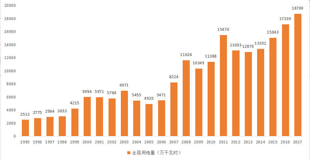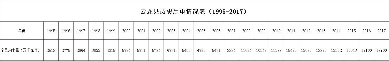 云龙县小水电资源丰富,大理云龙供电局前身的石门电厂负责管理的供电区域为石门镇、宝丰乡、果郎乡、关坪乡政府所在地用户。1999年前全县没有一个统一的供电管理机构,全县大多数乡镇在80年代均有自建的小水电站对区域内用电户进行供电,供电管理是由乡镇或企业设立的电管站(电力公司)负责,1999年前的全县用电量数据统计准确性有待证实,至2017年云龙县全社会用电量为1.87亿千瓦时,较1995年用电量2512万千瓦时增长了644.43%,年均增长率为25.65%。(数据详见下图)