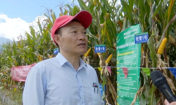 “牧青1号亩产是4669公斤,株高是3.53米,穗位高是159厘米,最终我们测产产量是4669公斤。如果明年我们能增加10%,增加400公斤左右,就能够达到亩产5吨以上。”云龙县农业农村局种子管理站站长胡正川现场向观摩群众介绍项目测产情况。